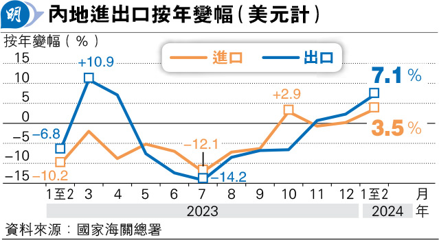 【明報專訊】中國海關總署公布今年1至2月份進出口數據,按美元計價,1至2月累計進口按年升3.5%(見圖),勝預期的2%,另受新興市場帶動,今年1至2月出口按年升7.1%,亦遠高預期的1.9%。貿易順差1251.6億美元,多過預期的1068億美元,但有分析指首兩個月的出入口數據較佳,或與農曆新年季節因素及工作日數較有關係,料3月出口增長或大幅放緩。