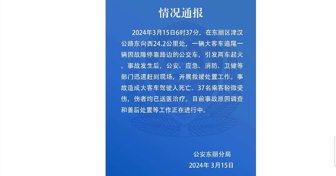 即時兩岸 天津旅巴追尾撞故障巴士 旅巴司機亡、37乘客傷 (13:35) 發佈於 2 年 前 2024 年 3 月 15 日 By 明報 天津市東麗區津漢公路與經三路交口西側今天(15日)上午6時37分發生一宗旅遊大巴追尾,撞到因故障停在路面的公共交通巴士,導致旅遊巴司機死亡,37名乘客受輕傷。 事故發生後,兩輛車起火燃燒,公安、應急、消防、衛健等部門到達現場開展傷者救助工作。目前,傷者均已在醫院就診,無生命危險。事故原因正在調查中。(央視) 相關文章:天津編輯推介車禍 Up Next 再有大陸漁民墮海 台方派船助搜救 (11:11) 不要錯過 台灣多名立委收炸彈恐嚇信 刑事局鎖定疑犯在西安 (22:50) 繼續閱讀 贊助商 猜你喜歡 WSJ:美國近10年1200萬汽車氣袋恐有缺陷被召回 逾兩成未回廠 曾有車主喪生 (18:17) 湖北十堰傳嚴重車禍 多名學童被撞 官方未通報 (01:19) 中央推動電動車火災事故報告制度 資深天使投資人 IT先驅肖慶平西藏車禍亡 資深天使投資者肖慶平車禍去世 (16:16) 廣西玉林多車連撞起火 兩童遇難