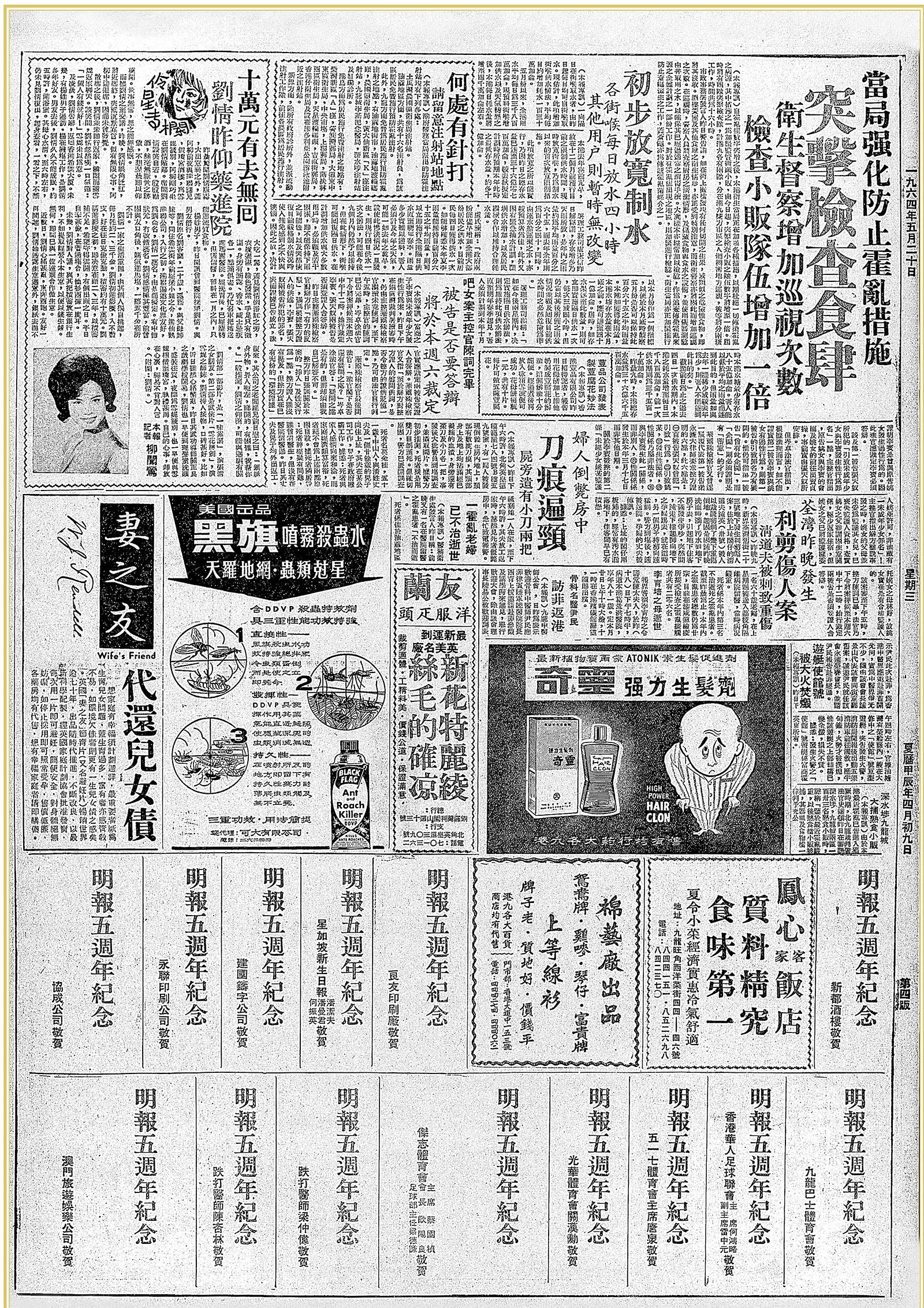 【明報專訊】1963年5月政府預告霍亂威脅。一年後,《明報》港聞版繼續報道持續已一年的霍亂問題,多一名老婦因霍亂逝世,當局將加強監管街頭小販,包括增加突擊檢查,如發現攤檔有切開的水果或類似危險食品,將會沒收;又列出全港多個免費注射霍亂疫苗地點。至於制水情况,經歷一年終紓緩,由每4日供水4小時增加至每日供水4小時,是制水後首次,主要歸功於天雨增多、運水船運來食水較預期多、深圳供水量增加等因素。