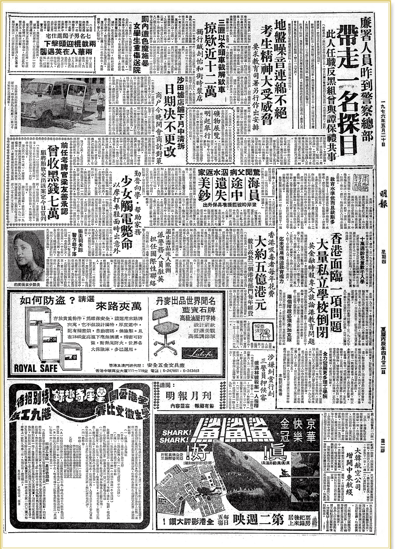 【明報專訊】1976年5月20日《明報》港聞版報道廉政公署人員到灣仔警察總部帶走一名反黑組探目,並解除其武器,另到反黑總局及探目(刑事偵緝警目)的住所搜查。翻查資料,廉署於1974成立後,曾多次高調進入警署帶走警務人員,並檢控多人,引起警方不滿。1977年近千警員於灣仔警總前集會請願,要求停止貪污調查,其後過百人到中環和記大廈闖入廉署,並毆打署方人員。其後港督麥理浩宣布特赦該年之前所有涉貪但未被檢控的公職人員,平息警廉衝突。