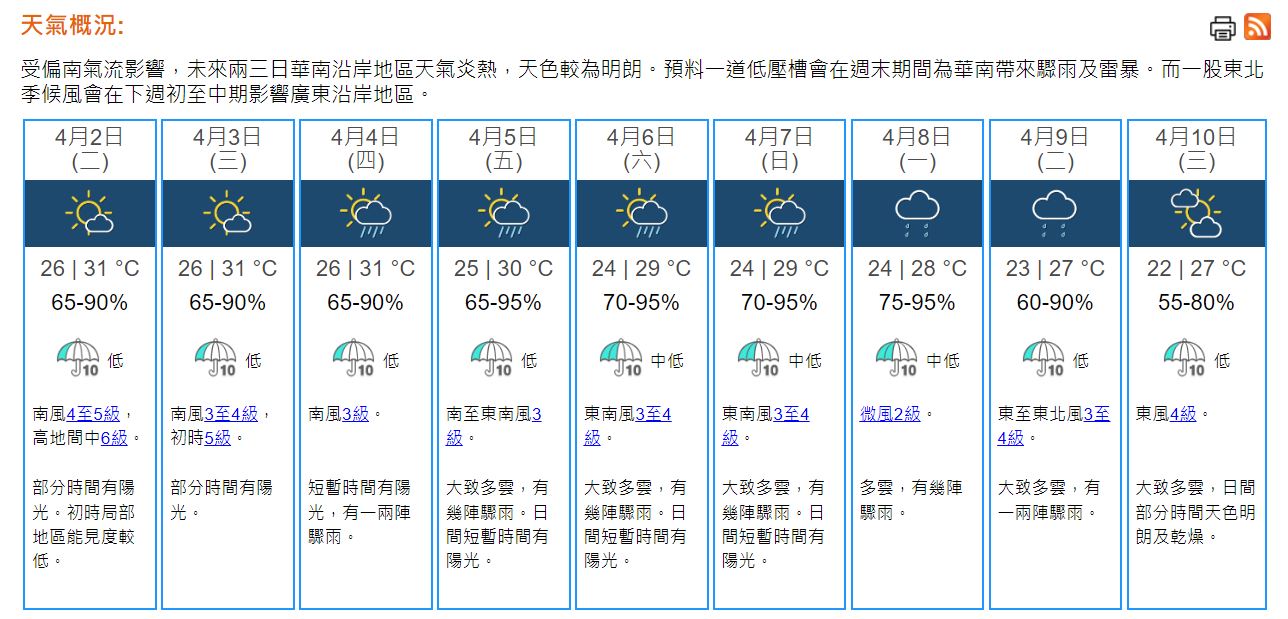 即時熱點 天氣|天文台:日間炎熱最高31°C (08:44) 發佈於 2 年 前 2024 年 4 月 2 日 By 明報 上午8時30分,天文台錄得27°C,相對濕度80%。一股偏南氣流正影響廣東沿岸。本港地區今日(2日)大致多雲,初時局部地區能見度較低。日間部分時間有陽光及炎熱,最高氣溫約31°C。吹和緩至清勁南風,高地間中吹強風。展望未來一兩日天氣炎熱,部分時間有陽光。本周後期有幾陣驟雨。(天文台) 相關文章:天文台天氣天氣速遞編輯推介 Up Next 九巴學生月票買二送一 即日至6月30日可登記【附登記連結】 (19:30) 不要錯過 文憑試DSE備戰|注意營養均衡 健腦增強記憶飲食貼士 (08:46) 繼續閱讀 贊助商 猜你喜歡 天氣|天文台:日間部分時間有陽光 最高22°C (08:32) 天氣|今日天晴乾燥 市區最高氣溫料25°C 聖誕節料早晚清涼 (09:12) 天氣|平安夜料溫暖 聖誕節市區氣溫最低15°C Boxing Day 14°C (20:15) 天氣|天文台:日間乾燥及溫暖 最高25°C (09:46) 天氣|天文台:日間部分時間有陽光 最高23°C (08:46) 天氣|天文台:日間乾燥 晚上漸轉多雲 (08:20)