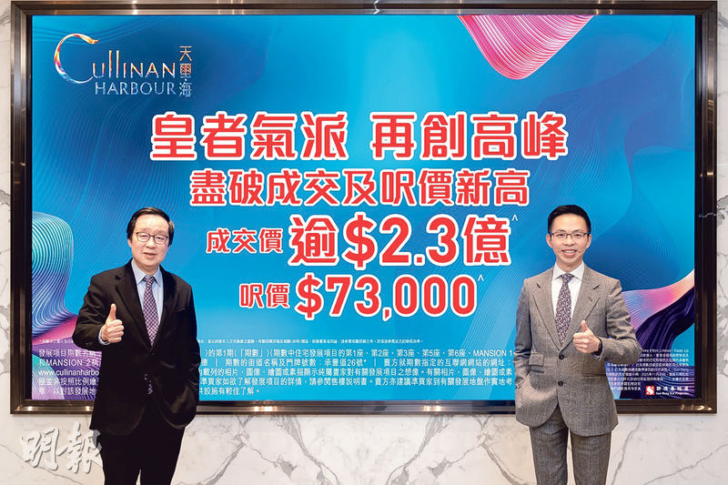 【明報專訊】「撤辣」後豪宅新盤價格屢創新高,其中被新地(0016)副董事總經理雷霆稱為啟德「跑道王者」的天璽.海,約半個月內兩度創下東九龍樓價新紀錄。項目最新售出的一個高座頂層連天台特色戶,成交價超2.3億元,實呎高達7.3萬元,無論售價及呎價均創東九龍一手住宅單位新高,成為區內新樓王。
