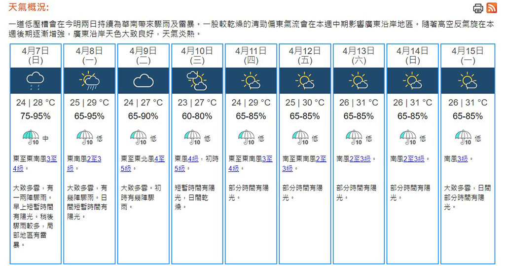 即時熱點 天氣|天文台:短期內香港廣泛地區或受大雨影響 (15:06) 發佈於 2 年 前 2024 年 4 月 7 日 By 明報 【15:05】天文台發出特別天氣提示,表示短期內香港廣泛地區可能受大雨影響,市民應提高警覺。 【09:45】上午9時40分,天文台錄得24.7°C,相對濕度87%。一道低壓槽正影響廣東,同時,影響廣東沿岸的偏東氣流正逐漸緩和。本港地區今日(7日)天氣預測大致多雲,有一兩陣驟雨,早上短暫時間有陽光。日間最高氣溫約28°C,稍後驟雨較多,局部地區有雷暴,吹和緩東至東南風。展望明日(8日)及周二(9日)仍有幾陣驟雨,隨後一兩日短暫時間有陽光。(天文台) 相關文章:天文台天氣天氣速遞編輯推介 Up Next 加沙戰事半年 短片回顧平民無辜喪命 流離失所面臨饑荒 (12:52) 不要錯過 世衛:希法醫院淪為「空殼」 遺體未妥善埋葬傳腐臭味【多圖】 (16:01) 繼續閱讀 贊助商 猜你喜歡 天氣|今日天晴乾燥 市區最高氣溫料25°C 聖誕節料早晚清涼 (09:12) 天氣|天文台:日間乾燥及溫暖 最高25°C (09:46) 天氣|天文台:日間部分時間有陽光 最高23°C (08:46) 天氣|天文台:日間乾燥 晚上漸轉多雲 (08:20) 天氣|天文台:日間乾燥溫暖 最高25°C (08:14) 天氣|天文台:周四天晴乾燥 最高23°C (20:50)