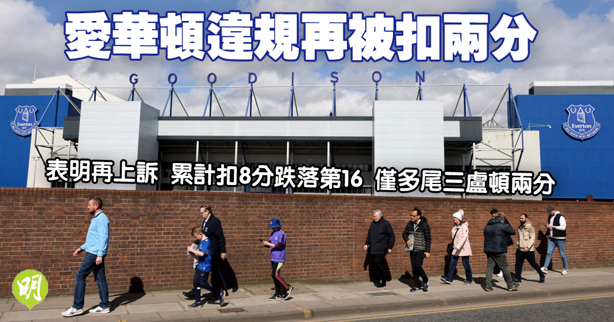 英超賽會今晚(8日)宣布,愛華頓在針對違反盈利和可持續發展規則(PSR)的指控提出上訴失敗後,在聯賽被追加罰扣兩分,今季累計被扣8分。「拖肥」今季第2次被扣分後31戰得27分,並由原先的第15位跌落第16位,但會方表明將計畫再次上訴。