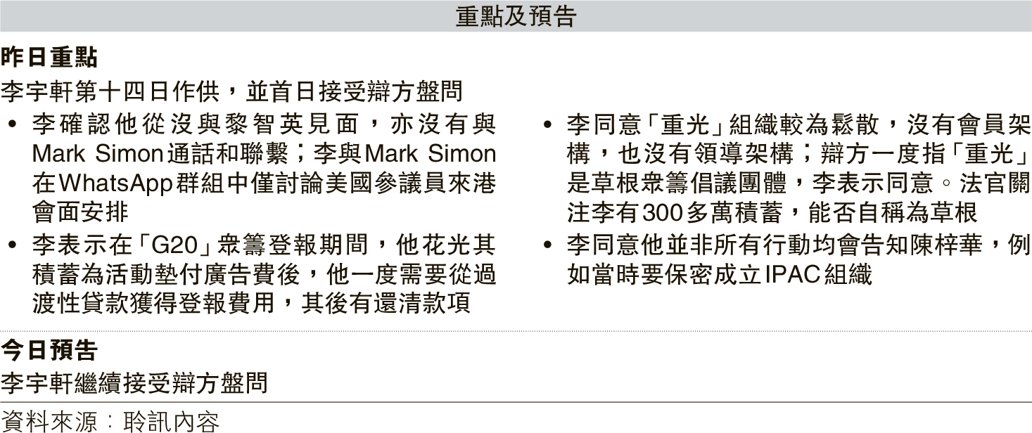 控方完成14天主問,辯方大律師Marc Corlett開始盤問李宇軒,李確認他從來無見過黎智英;至於其助手Mark Simon,二人亦從無通話和聯繫,但忘記對方是否他和陳梓華其中一組電郵來往的收件人之一,如有便是關於眾籌上的金錢事宜。