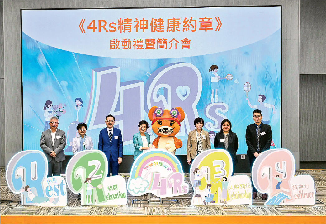 教育局長蔡若蓮昨在《約章》啟動禮稱,為更全面和有系統推廣校園精神健康,呼籲全港學校響應參加《約章》,訂立切實可行目標,採取行動促進學生身心健康。《約章》的「4Rs」涵蓋4個促進精神健康的要素及目標,包括休息(Rest)、人際關係(Relationship)、放鬆(Relaxation)及抗逆力(Resilience)。