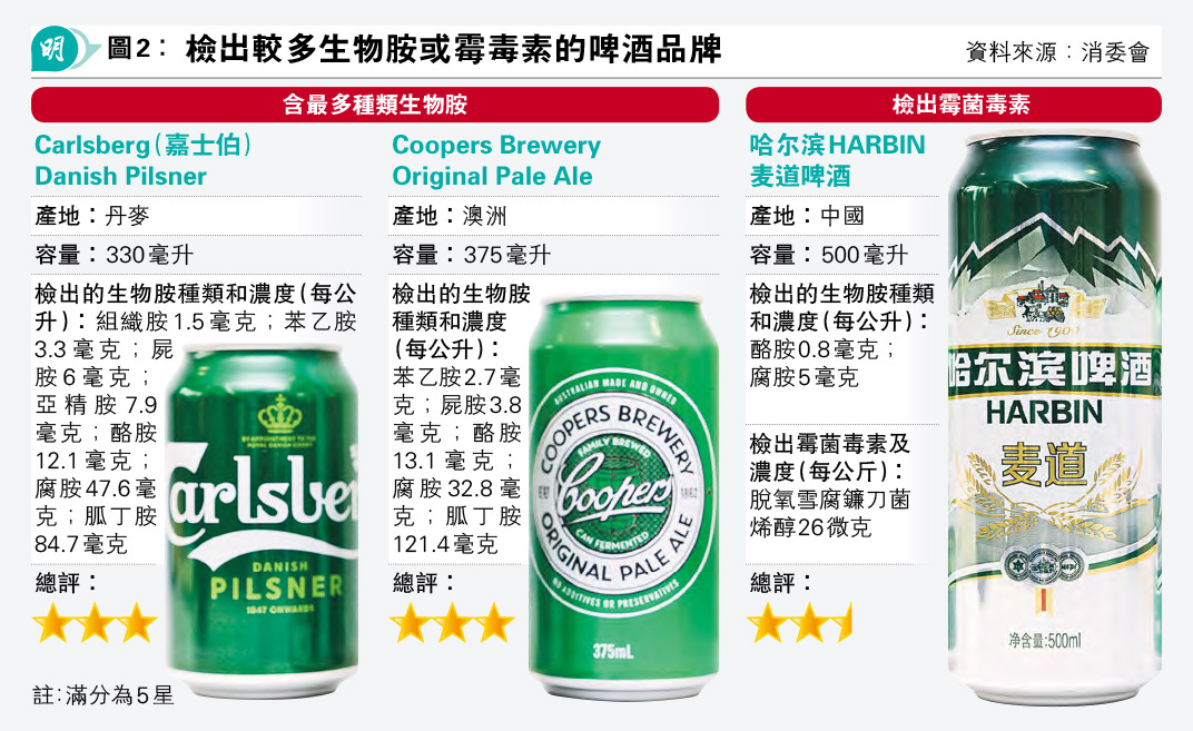 【明報專訊】消委會測試30款罐裝或支裝啤酒,發現飲用一罐或一支啤酒可攝入逾200千卡能量,即近乎一碗飯,若日飲兩罐啤酒,3個月內或會增加5磅脂肪。測試又發現全部啤酒樣本均含生物胺,當中兩款檢出的生物胺含量較高(圖2)。消委會亦在「哈尔滨HARBIN麦道啤酒」樣本檢出脫氧雪腐鐮刀菌烯醇(嘔吐毒素),過量攝入後30分鐘內可能會出現惡心、嘔吐、腹瀉、腹痛及發燒等徵狀。