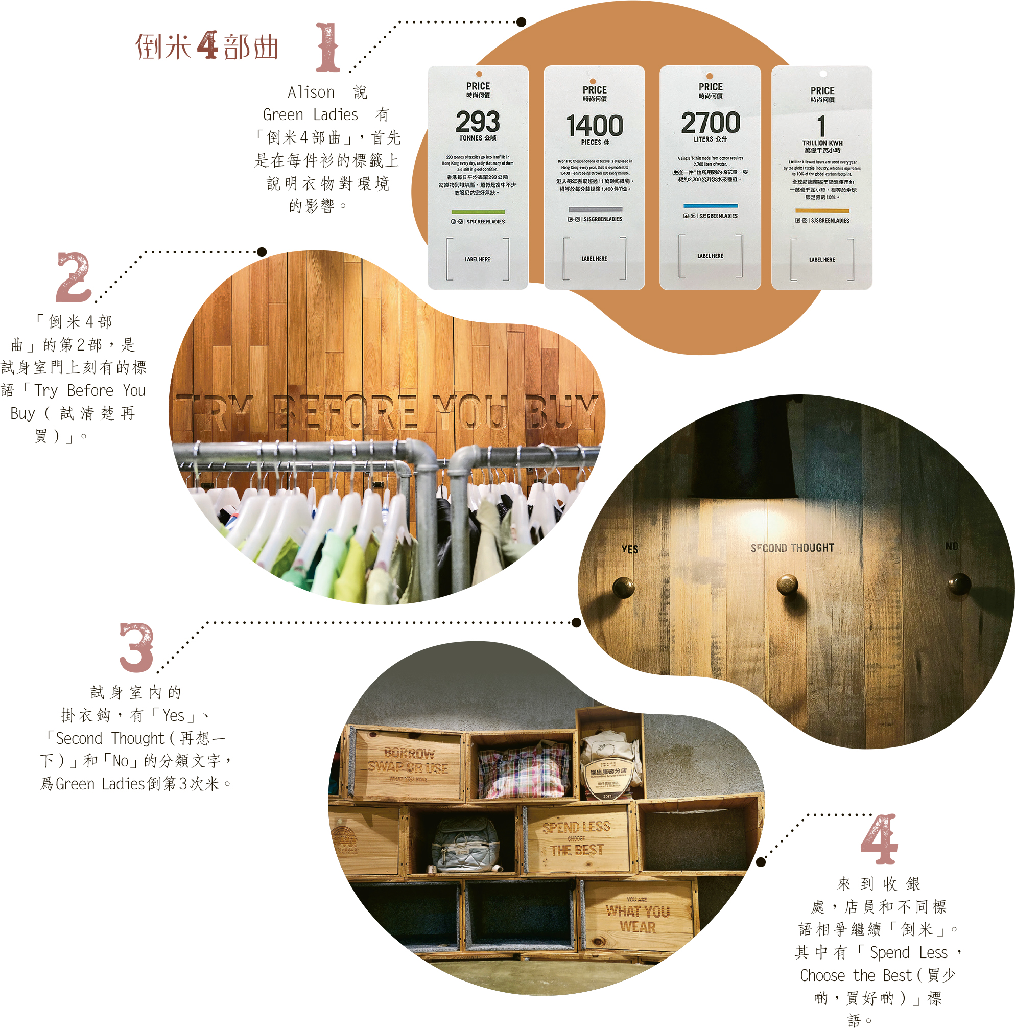 Alison也認同應少買衫,她指Green Ladies亦鼓勵「spend less(買少啲)」,但「choose the best(買好啲)」。不過,向人們灌輸快時尚對環境的影響需要時間,在spend less成為社會主流前,建議人們買衫後怎麼善用衣物,是雙軌並行的環保策略。「買衫不是不好,但你可以想想,衣櫃裏面是否已經有類似的款式,是不是買二手,instead(而不是)全新呢?」