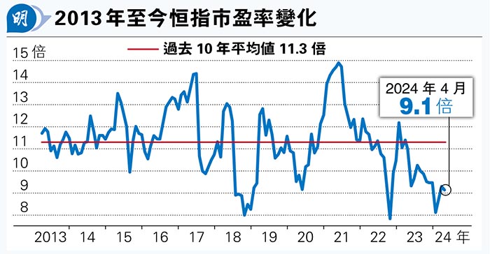 以恒指上周五收市價16,224點計,市盈率只有9.1倍,低於過去10年平均值的11.3倍(見圖),估值如此低是否也不足以吸引國際投資者的青睞呢?