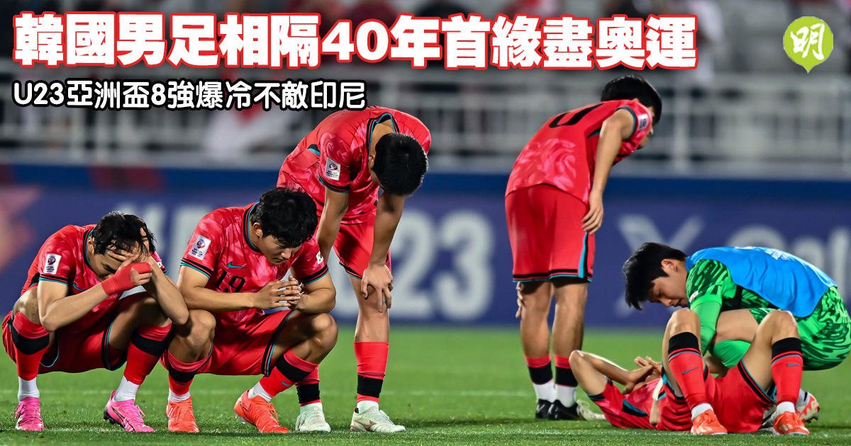 U23亞洲盃8強今晨(26日)出現爆冷戰果,前屆冠軍韓國隊有一人領紅被逐下,戰至加時2:2逼和有韓國前帥申台龍倒戈領軍的印尼隊,最終互射12碼階段鬥足12輪有兩球射失負10:11,令「太極虎」40年來首次無緣奧運。賽後韓媒稱韓國足球步入「最黑暗時代」,更抨擊及要求韓國足總會長鄭夢奎引咎辭職。至於日本隊則加時4:2挫10人應戰的卡塔爾隊,離巴黎奧運資格只差一步。