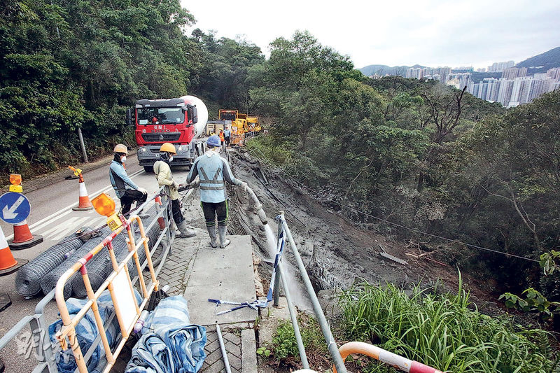 【明報專訊】前日暴雨導致本港多區山泥傾瀉,土力工程處至昨早共接獲17宗山泥傾瀉報告,包括西貢清水灣道近坑口永隆路,該處山坡出現大面積塌陷,部分行人路崩塌消失,暫需封閉一條行車線。運輸及物流局長林世雄昨到上址視察,已安排承辦商噴漿,臨時鞏固斜坡,稱有信心於今早繁忙時間前恢復正常雙線行車。