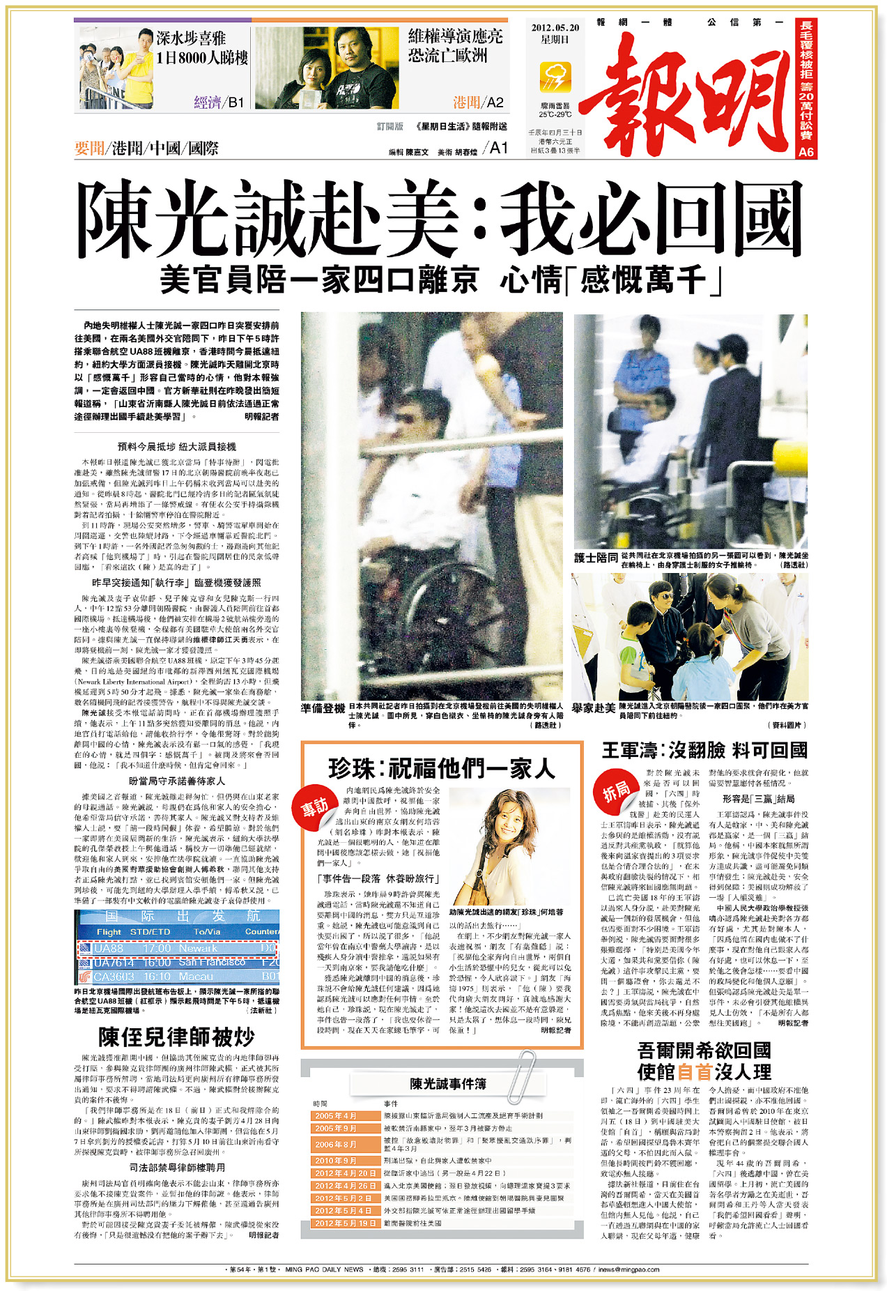 【明報專訊】2012年5月20日《明報》報道,被軟禁的內地維權人士陳光誠逃到美國駐華大使館求助,引發外交風波,最後獲北京「特事特辦」批准赴美留學,與妻子及兒女一同到紐約。