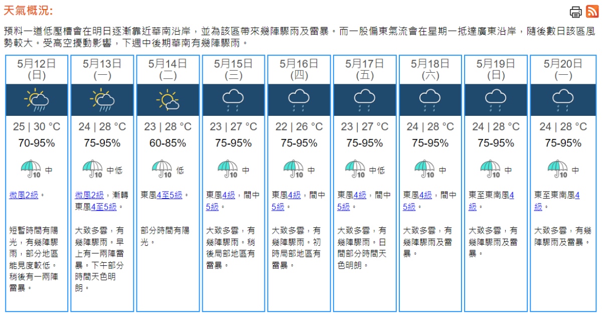 即時熱點 天氣|天文台:最高29°C 有一兩陣驟雨 (11:45) 發佈於 2 年 前 2024 年 5 月 11 日 By 明報 上午11時30分,天文台錄得28.4°C,相對濕度71%。 現時影響廣東沿岸的偏東氣流正逐漸緩和。同時,驟雨影響廣東沿岸地區。本港地區今日(11日)天氣預測短暫時間有陽光,有一兩陣驟雨。吹和緩東風。最高氣溫約29°C。展望明日(12日)有幾陣驟雨,短暫時間有陽光,稍後至下周一(13日)早上局部地區有一兩陣雷暴。周一下午及周二天色較為明朗。(天文台) 相關文章:天文台天氣天氣速遞 Up Next 短片:太平清醮無人機表演現平安包山、醒獅圖案 市民讚特別 (22:04) 不要錯過 日月掠影系列|2015年5月20日的《明報》 (11:50) 繼續閱讀 贊助商 猜你喜歡 天氣|天文台:周一市區16°C-20°C 多雲乾燥 相對濕度料低至45% (19:08) 天氣|天文台:今日大致多雲非常乾燥 市區氣溫料16°C-20°C (09:40) 天文台:冷鋒稍後橫過廣東沿岸 周日早上市區最低14°C (12:22) 天氣|天文台:多雲有陣雨 午夜氣溫低至16°C (10:07) 天氣|天文台:周六多雲有雨 日間最高22℃ 午夜跌至16℃ (21:48) 天氣|天文台:天晴乾燥最高24°C 明日氣溫顯著下降 (08:43)