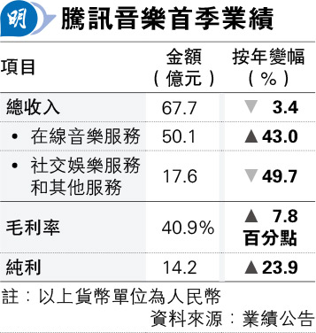 【明報專訊】騰訊音樂(1698)公布首季業績,總收入按年跌3.4%至67.7億元(人民幣,下同);純利按年增長23.9%至14.2億元;經調整利潤增21%至17億元。