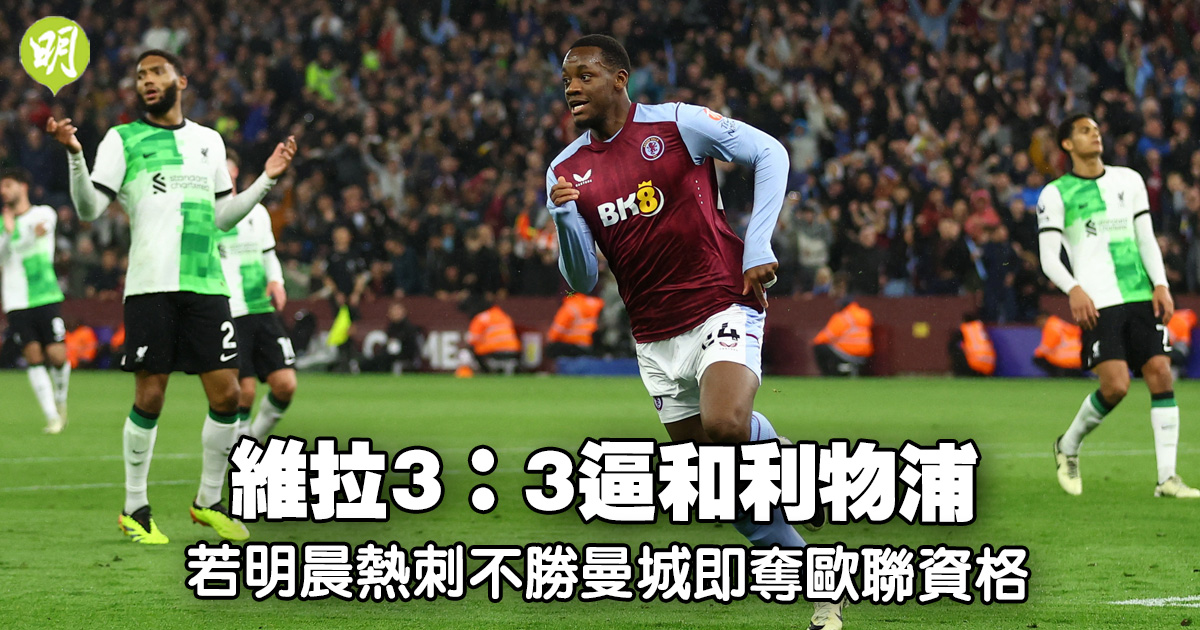 英超今晨(14日)上演前列戰,第4位的阿士東維拉克服一度落後兩球的劣勢,在比賽末段藉後備登場的前鋒祖漢杜蘭梅開二度,終在主場以3:3逼和季席的利物浦,多賽1場下領先明晨迎戰曼城的第5位球隊熱刺5分,意味熱刺如未能擊敗「藍月」,維拉即可取得來季歐聯資格。