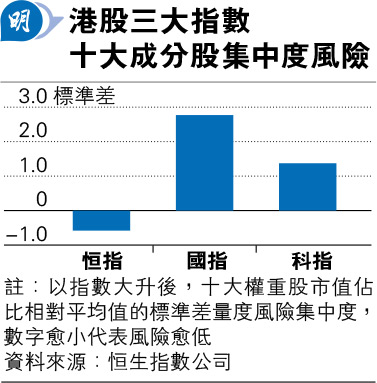 截至5月10日,恒指、國指及科指,首十大成分股權重為54%、59%及72%,分別處於各自長期平均值(2021年6月底至2024年5月10日期間)的-0.6、2.8及1.4標準差,可見恒指的集中度風險最低。相關指數亦低於歷史平均水平,其中恒指(18,964點)、國指(6719點)及科指(3962點)目前為平均水平-0.4、-0.3及-0.5的標準差。報告認為,恒指處相對較低的指數水平,以及相對較低的集中度風險。雖然國指及科指,有相對較高的集中度風險,但由於仍處相對較低的指數水平,故即使近期指數集中度上升,下行風險仍有限。