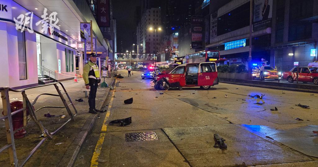 69歲男途人懷疑被碎片擊中受傷,他與四肢受傷的27歲姓楊的士司機及38歲姓施男乘客清醒被送往廣華醫院治理。警方接報圍封現場調查。現場所見,其中一人倒臥於附近銀行門口,車身零件碎落於行人路及行車路上,一列欄杆及撞至變形扭曲。涉事的士車頭有損毁,而涉事電單車被撞後疑衝前約20米,其旁邊遺下血跡。