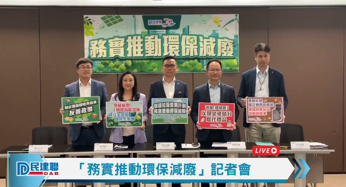 民建聯提出的11項推動環保減廢建議,包括放寬就私人屋苑申請廚餘機相關資助的要求、增加綠在區區回收點、推動綠在區區公私營合作、研究推出產品的環保回收標籤制度、發展更多新型轉廢為能設施、與大灣區城市合作建立綠色生態圈等。