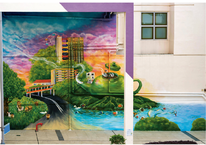 【明報專訊】香港藝術中心去年聯同新生精神康復會及香港房屋協會,在祖堯邨展開為期2年的「心靈友善屋邨@祖堯邨」計劃,帶來一連串公共藝術項目。最引人注目的是3幅大型壁畫,以過去、現在、未來為主題,分別位於邨內的巴士站、天橋兩側及啟敬樓旁的樓梯。