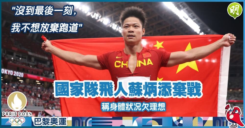 中國國家隊短跑名將蘇炳添今(5日)在社交網證實,將會缺席巴黎奧運田徑項目。他指出自己身體狀况和成績未達標準,但強調不會因此言退,「沒到最後一刻,我不想放棄跑道」。