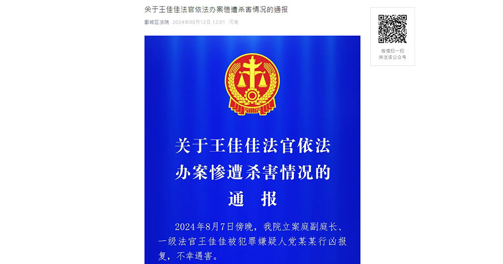 河南省漯河市郾城區法院今日(12日)通報,該院立案庭副庭長、37歲一級女法官王佳佳上周三(7日)被犯罪嫌疑人用刀割喉報復遇害。法院通報稱,對法官王佳佳的不幸遇害表示沉痛哀悼和無比痛惜,對殺害辦案法官的犯罪行為表示極大憤慨和強烈譴責。