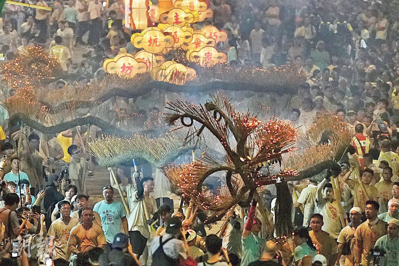 【明報專訊】今日中秋節,一連3日的大坑舞火龍已於昨晚迎月夜率先上演,晚上7時許先由數十名小朋友舉起由LED燈製成的「小火龍」打頭陣,其後經典「大火龍」壓軸登場,由300名健兒舞動全長67米、由1.2萬支燃燒的線香組成的傳統火龍。有上海遊客稱喜歡人文活動,專程前來體驗舞火龍的文化氛圍;亦有父親帶同8歲兒子觀賞表演 ,期望孩子感受「人間煙火」。