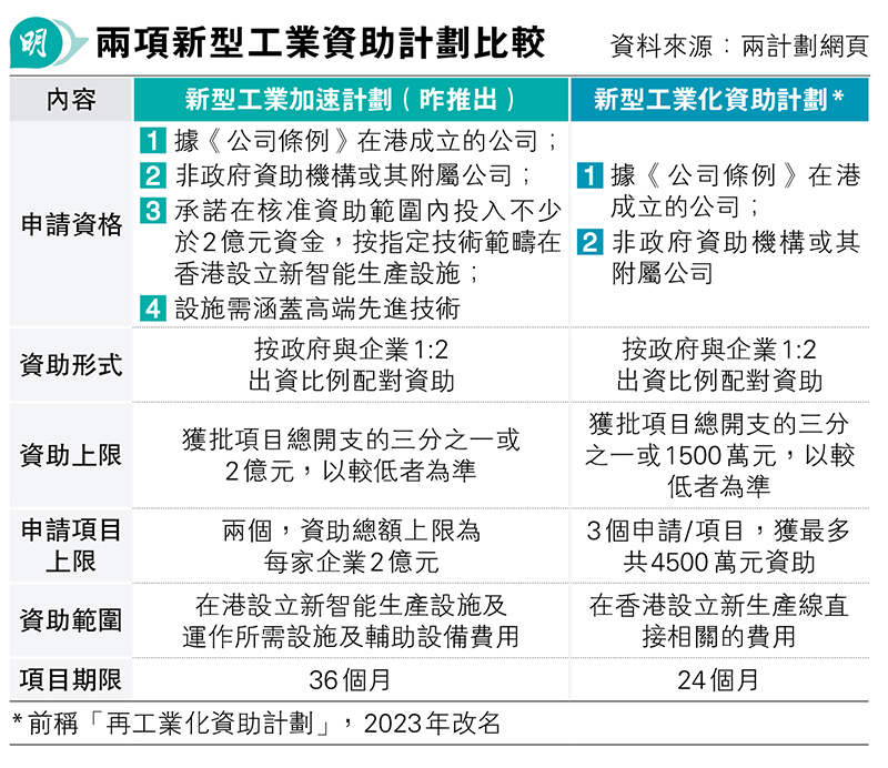 新計劃針對3個產業:生命健康科技、人工智能與數據科學、先進製造及新能源科技,提供資助建設智能生產設施。資助範疇類似「新型工業化資助計劃」,但規模遠大於後者(見表)。