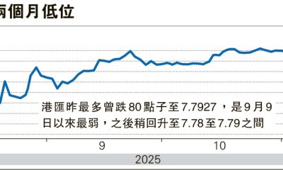 截至昨晚8時15分港匯報7.7632,升83點子(1元等於1萬點子)。至於港元拆息昨日個別發展,在9月底季結後第一個交易日,短期拆息回落,隔夜拆息跌141.04點子(1厘等於100點子)至4.98226厘。1星期拆息跌17.38點子至4.77488厘。與樓按相關的1個月拆息連升8日,升2.38點子至4.34476厘;中長期拆息方面,3個月期拆息升19.35點子至4.37375厘。6個月期拆息升4.04點子至4.06851厘。12個月期拆息跌1.51點子至3.95345厘。