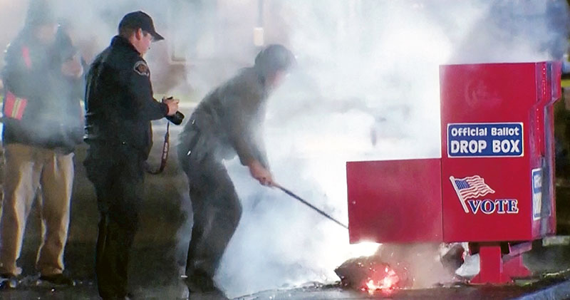 周一首宗縱火案約於當地凌晨3時半發生,事發於俄勒岡州波特蘭市中心一條行人路上的選票投遞箱(drop box),警方事後在箱內發現「燃燒裝置」。到凌晨4時許,距波特蘭約24公里的華盛頓州西南部溫哥華市也有街邊投遞箱被縱火,箱旁有可疑裝置。波特蘭案的票箱內有滅火劑保護選票,僅3張選票受損,選舉當局保證承認該箱保存下來的409張選票。溫哥華市縱火案的票箱滅火裝置卻未能啟動,選舉部門表示可能燒毁了「數百張」選票,提供網站供選民確認個人選票狀况,又呼籲在上一次收票時間(上周六早上11時)後投票入涉事票箱的選民,馬上跟選舉審計員辦公室聯絡再投票。執法部門表示將加強選票收集箱周圍的24小時保安。克拉克縣選舉部門周一決定改為每晚收集選票及派人站崗,呼籲選民於下午5時半前投票。