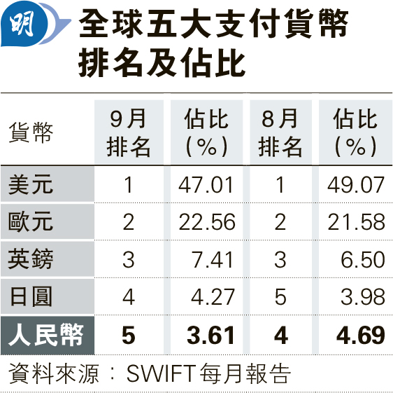 【明報專訊】國際支付結算系統SWIFT統計數據顯示,若以支付金額計,9月份人民幣國際支付比例為按月跌1.08個百分點至3.61%,在全球主要支付貨幣的排名亦下跌一名至第五,事隔1年全球排名再被日圓超越。