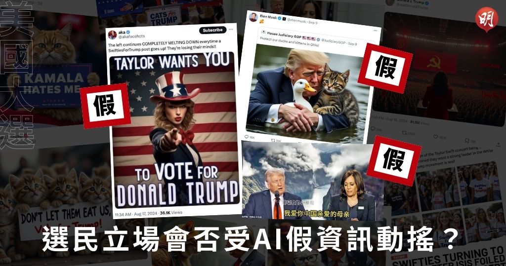 美國總統大選即將在11月5日舉行,是人工智能(AI)浪潮席捲全球以來最具影響力的選舉,有人更將之形容為「AI大選」(AI Election)。AI熱潮下衍生的大選假資訊也隨之湧現,如社交媒體散播假圖假片、聊天機械人提供選舉假資訊、「AI拜登」致電選民呼籲不要投票等。選民投票意向會否被種種AI假象動搖?