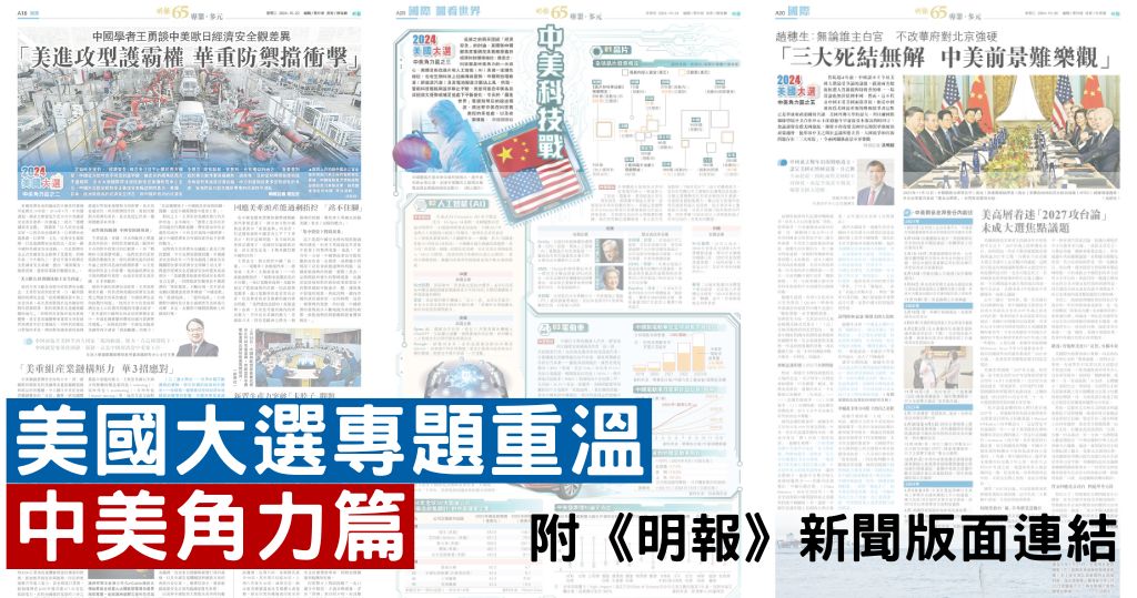 《明報》國際組並刊登美國丹佛大學約瑟夫.科貝爾國際關係學院中美合作中心主任趙穗生的專訪,剖析中美之間存在的「三大死結」如何限制雙邊關係的前景,並有另文探討台海局勢和兩名候選人政策。