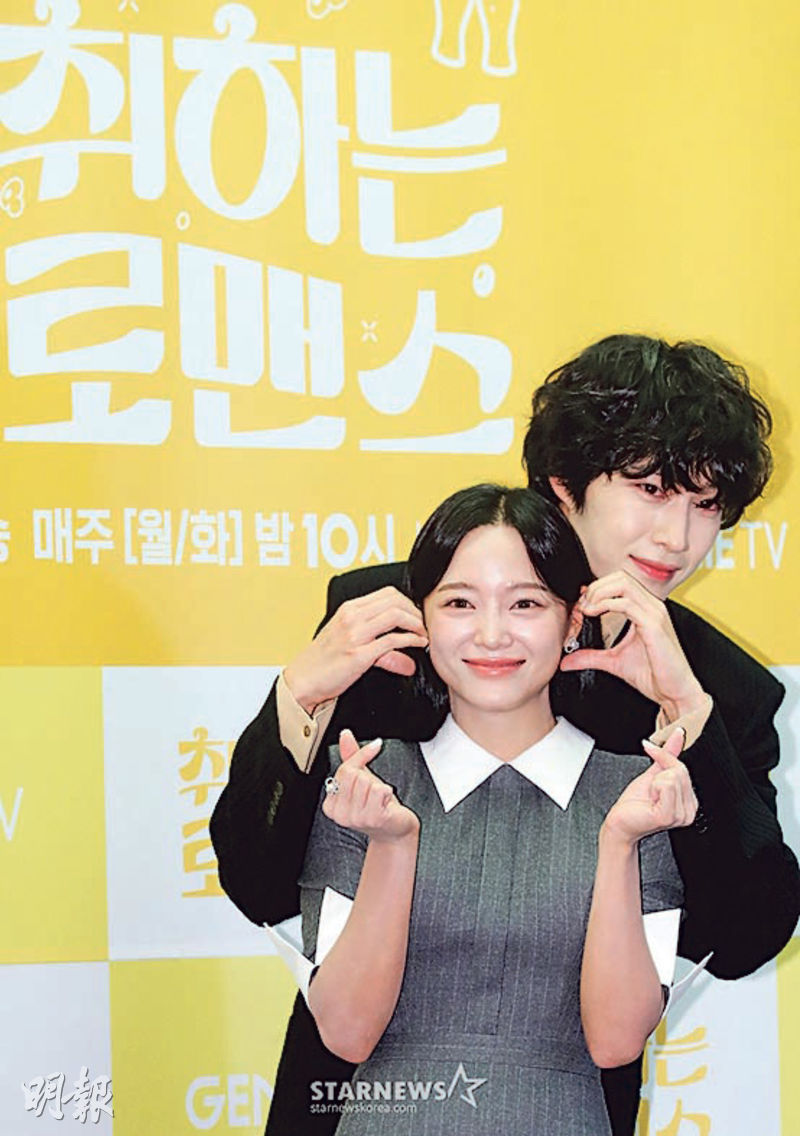 【明報專訊】《社內相親》金世正與《夜晚開的花》李鍾元合演韓國有線頻道ENA新劇《酒醉羅曼史》昨晚首播,同日下午舉行記者會,男女主角跟拍檔申度賢和白成哲一同出席。香港觀眾可透過煲劇平台「黃Viu」收看。