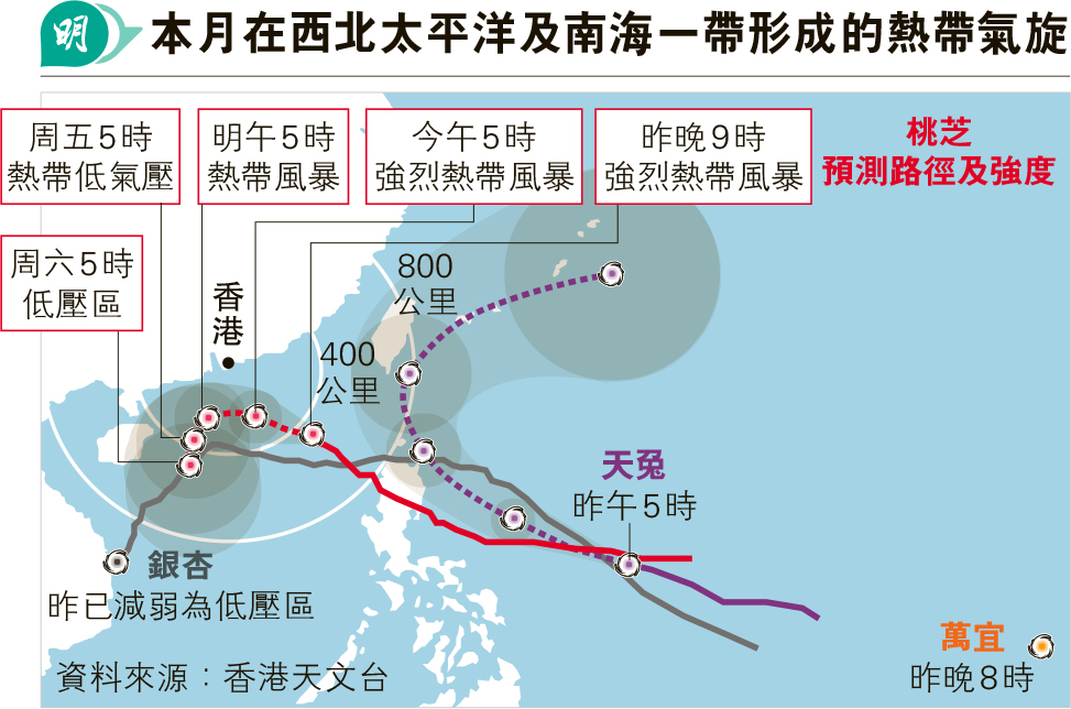 【明報專訊】繼上周影響本港的熱帶氣旋「銀杏」遠離及減弱成低壓區,天文台前日因應「桃芝」接近,發出1號戒備信號。天文台昨晚表示,會考慮在今午改發3號強風信號,並預料桃芝明早最接近香港。與此同時,兩個熱帶氣旋「天兔」及「萬宜」亦正在呂宋以東形成,天文台高級科學主任李淑明向本報稱,在11月同時有4個熱帶氣旋在西北太平洋及南海範圍出現,屬1961年有紀錄以來首次。