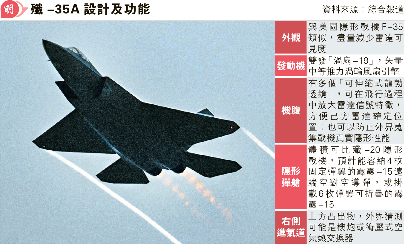 【明報專訊】第十五屆中國國際航空航天博覽會(珠海航展)昨(12日)在廣東珠海開幕,多件被稱為「國之重器」的中國空軍、海軍及陸軍武器裝備首次公開亮相,其中外界高度關注的隱形戰機殲-35A首次公開飛行。殲-35系列為彈射型航母艦載機,預料將在航母福建艦裝備。