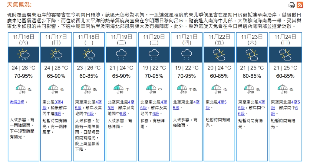 上午10時,天文台錄得氣溫26.1°C,相對濕度86%。本港地區今日(16日)天氣預測大致多雲,有一兩陣驟雨,最高氣溫約28°C。下午短暫時間有陽光。吹微風。展望周日(17日)短暫時間有陽光。隨後兩三日風勢頗大,氣溫逐步下降,天文大潮期間晚上個別低窪地區可能出現輕微水浸。下周中期有幾陣雨,最低氣溫降至19°C或以下。
