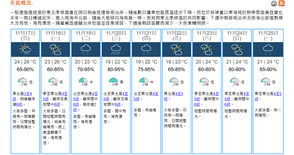 【10:15】上午10時,天文台錄得氣溫26.1°C,相對濕度86%。本港地區今日(16日)天氣預測大致多雲,有一兩陣驟雨,最高氣溫約28°C。下午短暫時間有陽光。吹微風。展望周日(17日)短暫時間有陽光。隨後兩三日風勢頗大,氣溫逐步下降,天文大潮期間晚上個別低窪地區可能出現輕微水浸。下周中期有幾陣雨,最低氣溫降至19°C或以下。