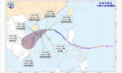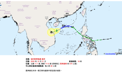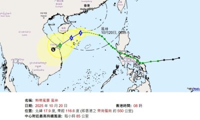 下午4時,超強颱風萬宜集結在馬尼拉之東南偏東約490公里,預料向西北偏西移動,時速約22公里,移向呂宋。此外,熱帶低氣壓天兔已在台灣南部附近減弱為低壓區。(天文台)