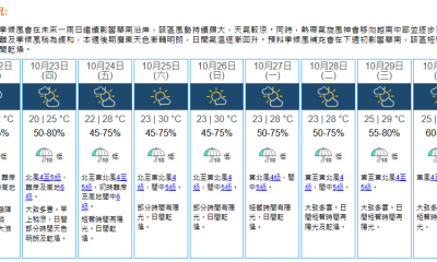 【10:15】上午10時,天文台錄得氣溫26.1°C,相對濕度86%。本港地區今日(16日)天氣預測大致多雲,有一兩陣驟雨,最高氣溫約28°C。下午短暫時間有陽光。吹微風。展望周日(17日)短暫時間有陽光。隨後兩三日風勢頗大,氣溫逐步下降,天文大潮期間晚上個別低窪地區可能出現輕微水浸。下周中期有幾陣雨,最低氣溫降至19°C或以下。