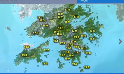 【18:25】本港地區今晚(16日)及明日(17日)天氣預測:大致多雲,早晚有一兩陣驟雨。明日日間短暫時間有陽光。氣溫介乎24℃至28℃。吹微風,明日漸轉吹和緩東北風,稍後離岸達強風程度。展望隨後兩三日風勢頗大,氣溫逐步下降,天文大潮期間晚上個別低窪地區可能出現輕微水浸。下周中期間中有雨,最低氣溫降至19℃或以下。