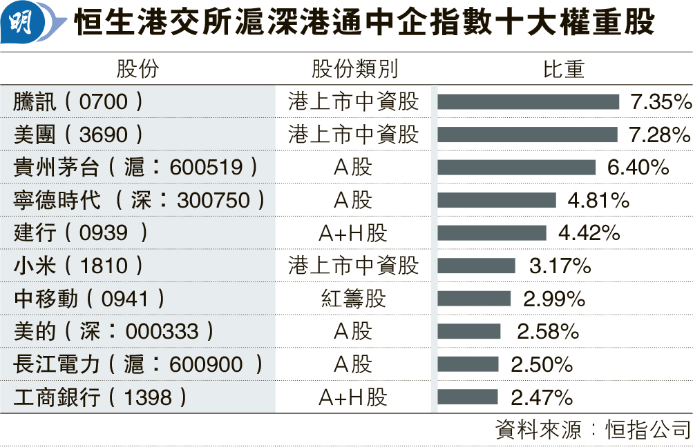 至於新推出的滬深港通中企指數A股與港股上市中資股分佈較平均,首十大持股比例的股份當中,A股與港股上市成份股各佔一半(見表),而持股佔比最多分別為騰訊(0700)的7.35%。有分析認為,該指數較MSCI中國指數更能全面反映A股及港股上市中資股的整體表現。但是拼多多(美:PDD)等美股上市大型中概股未能包括在新指數中,而拼多多以3.86%權重為MSCI中國第四大重磅股。
