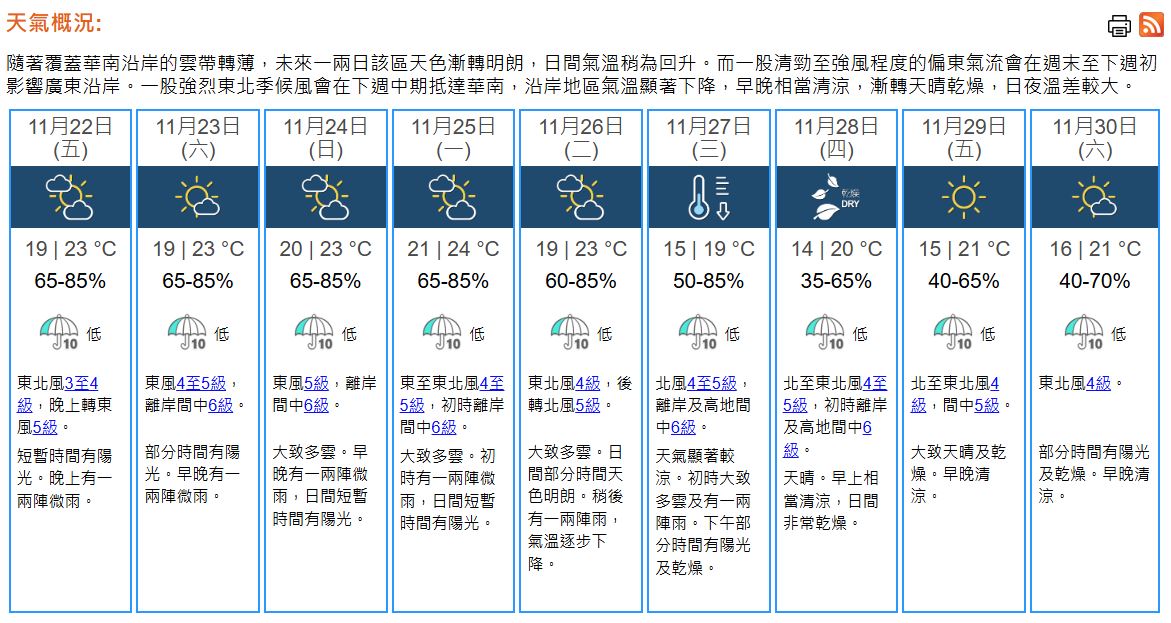 即時熱點 天氣|天文台:最高23°C 未來兩三日風勢頗大 (08:47) 發佈於 11 個月 前 2024 年 11 月 22 日 By 明報 上午8時30分,天文台錄得19.3°C,相對濕度78%。 一道雲帶正覆蓋華南沿岸。此外,華東氣壓正在上升,預料影響廣東沿岸的東北季候風會在今晚(22日)被一股偏東氣流取代。 本港地區今日大致多雲。日間短暫時間有陽光,最高氣溫約23°C。吹和緩東北風。晚上轉吹清勁東風,有一兩陣微雨。展望未來兩三日風勢頗大,短暫時間有陽光。下周中期天氣顯著轉涼。(天文台) 相關文章:天文台天氣天氣速遞編輯推介 Up Next 中國書畫拍賣預展 黃永玉4米巨幅《野茶客》、張大千手繪旗袍免費賞【附登記連結】 (13:18) 不要錯過 短片:又一城5米水怪雪山迎聖誕 (18:57) 繼續閱讀 贊助商 猜你喜歡 天氣|天文台:周五有驟雨 氣溫28至32°C (19:45) 天氣|天文台:周四局部地區有驟雨 日間炎熱最高32°C (21:00) 天氣|天文台:今早多處地區錄5毫米雨量 今日多雲有驟雨 下午部分地區雨勢較大有雷暴 (09:20) 天氣|酷熱警告生效 天文台:周末有一兩陣驟雨 (08:22) 天氣|天文台:周四天晴局部地區有驟雨 最高32°C (20:56) 今年10月已有4日達33℃以上 破1884年以來紀錄 (17:45)