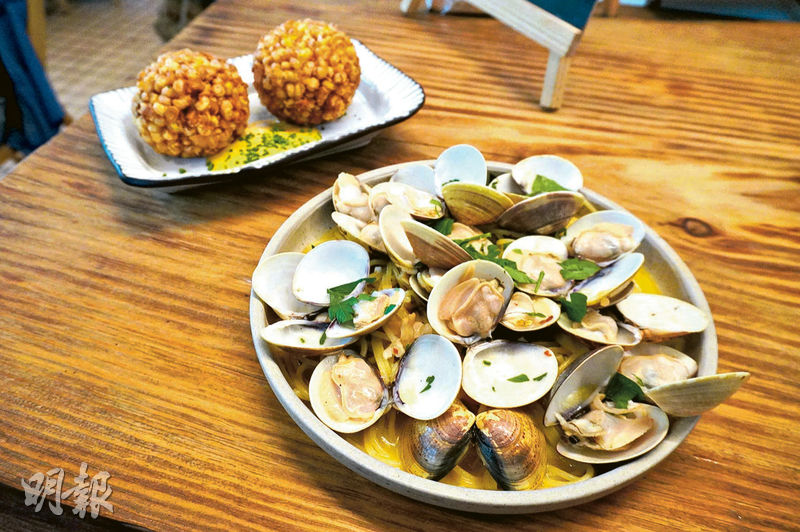 Cafe Je T’aime2環境寬敞、舒適,店內採光不錯,落地大玻璃、挑高樓底引入陽光,室內設計以花藝、葉材,打造出自然舒適的氛圍。咖啡店特意選用木調家具,部分更來自志記鎅木廠,讓這些本地積存木以木藝品形式延續生命。來到這裏,除可品嘗以本地食材入饌的菜式如大澳鹹魚茄香蝦意粉($168)、煎封本土原條石䱽魚佐史拉差白酒牛油($298)外,白酒蜆意大利粉($148)亦是推介美食,飽滿的蜆密密麻麻地鋪在意粉上,幾乎看不見下面的意粉,吃起來滿足得很!胃口小一點的,推薦試試香脆粟米球本土芝士醬($68),比成人拳頭還要大的粟米球炸得香脆,沾上用「中式芝士」腐乳製成的醬汁,味道意外地相襯。