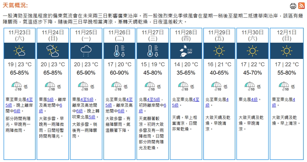 本港地區今日大致多雲。日間短暫時間有陽光,最高氣溫約23°C。吹和緩東北風。晚上轉吹清勁東風,有一兩陣微雨。展望未來兩三日風勢頗大,短暫時間有陽光。下周中期天氣顯著轉涼。(天文台)