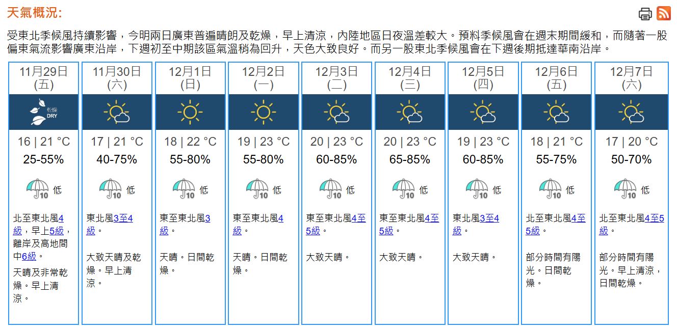即時熱點 天氣|天文台:今早最低16.6°C 入秋最低紀錄 (08:46) 發佈於 11 個月 前 2024 年 11 月 29 日 By 明報 上午8時30分,天文台錄得氣溫17.1°C,相對濕度36%。 乾燥的東北季候風正為廣東帶來普遍晴朗的天氣。本港今早(29日)清涼,截至上午7時30分,天文台錄得最低氣溫16.6°C,是入秋以來的最低紀錄,新界再低兩三度。 本港地區今日天晴及非常乾燥。早上清涼。日間最高氣溫約21°C。吹和緩北至東北風,早上風勢清勁,離岸及高地間中吹強風。展望未來兩三日持續天晴乾燥。周六(30日)早上仍然清涼。下周初氣溫稍為回升。(天文台) 相關文章:天文台天氣天氣速遞編輯推介 Up Next 短片:624萬美元投得「牆上香蕉」 幣圈投資者孫宇晨當眾吃掉讚好吃 (14:50) 不要錯過 天氣乾燥|濕度降至28% 皮膚保濕宜忌 (15:29) 繼續閱讀 贊助商 猜你喜歡 天氣|天文台:周五有驟雨 氣溫28至32°C (19:45) 天氣|天文台:周四局部地區有驟雨 日間炎熱最高32°C (21:00) 天氣|天文台:今早多處地區錄5毫米雨量 今日多雲有驟雨 下午部分地區雨勢較大有雷暴 (09:20) 天氣|酷熱警告生效 天文台:周末有一兩陣驟雨 (08:22) 天氣|天文台:周四天晴局部地區有驟雨 最高32°C (20:56) 今年10月已有4日達33℃以上 破1884年以來紀錄 (17:45)