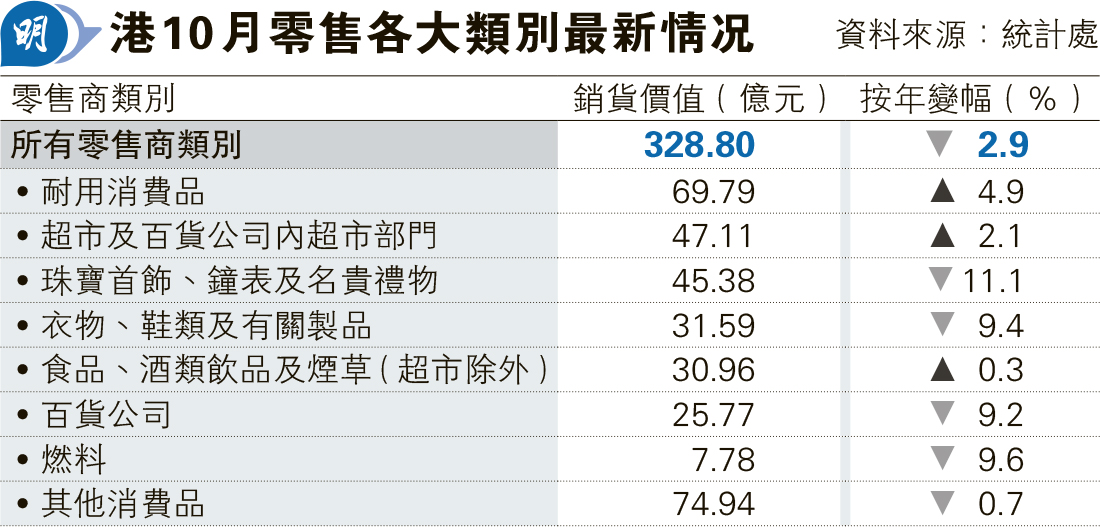 【明報專訊】香港統計處公布,10月零售業銷貨額的臨時估計為329億元,按年跌2.9%,較市場預期跌5.5%為小。政府發言人表示,市民和旅客的消費模式轉變對提振本地市場消費仍構成制約。分析認為,消費模式轉變料中長線繼續影響本港零售業發展,料明年表現大致持平。