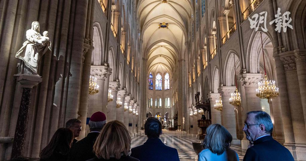 法國巴黎聖母院大教堂2019年發生大火,歷經5年半的重建工程後,將於12月7日舉行重開慶祝活動,12月8日正式開放予公眾參觀。法國總統馬克龍伉儷、巴黎總主教Laurent Ulrich及巴黎市長等官員,周五(29日)到場視察,並進行電視直播。重建後大教堂內部情況首度公開,可見拱頂、彩色玻璃窗及其他結構都已修復。翻新工程動員共約2000名工匠、專家、工程師等,總支出達7億歐元(約57.6億港元)。(法新社/BBC)