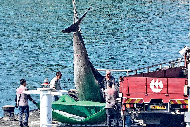 【明報專訊】前日擱淺大澳的鯨魚,專家稱麻醉期間其身體狀况已非常虛弱,最終在診斷期間死亡,鯨屍昨日解剖。漁護署初步評估牠屬喙鯨科(Ziphiidae),未發現螺旋槳或船撞擊痕迹,但在鯨魚的消化系統內發現一個大型帆布袋,最終死因需進一步分析。