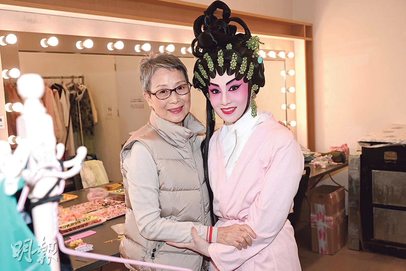 【明報專訊】班主彭美施任出品人的粵劇《秦淮瑣月》,由新一代花旦梁非同、文武生王志良與梁振文,以及花旦梁燕飛主演,一連兩場假西九戲曲中心公演,陳寶珠前晚捧場,到後台為女主角梁非同打氣。