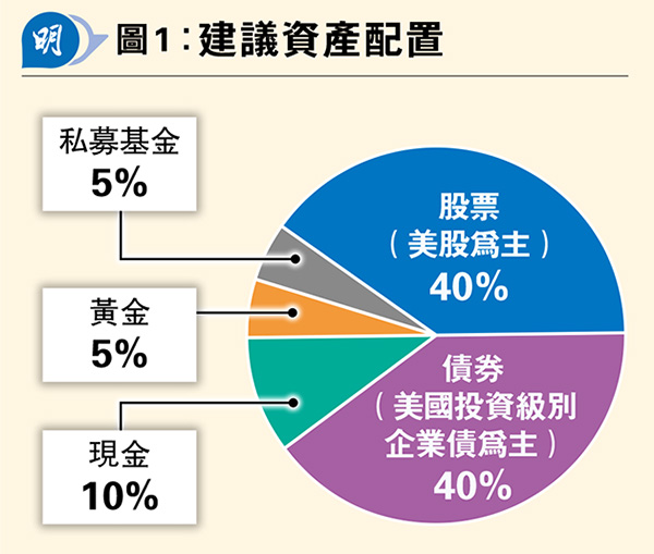 在資產配置方面,曾敏聰建議,股票(美股為主)、債券(美國投資級別企業債為主)、現金、黃金及私募基金分別佔40%、40%、10%、5%及5%(見圖1)。現時與6月時的建議比較,股票及債市上均轉為聚焦美國市場,相對增持現金,並且加入黃金及私募基金,他以下就黃金的投資價值亦有精闢分析。